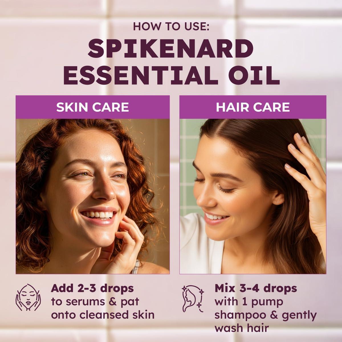 Pamper your scalp & hair. Keep your hair frizz-free with a few drops of spikenard oil for hair working to deeply nourish and hydrate your hair and scalp over time. Mix 3-4 drops of spikenard oil hair with carrier oils to craft nourishing hair oils.