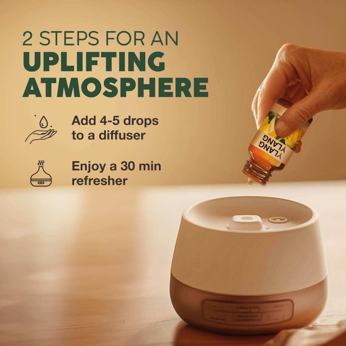 Relaxing aromatherapy with ylang ylang Essential oil. Ylang ylang Essential oil is perfect for diffusion, creating a soothing and calming atmosphere. Add 4-5 drops of ylang ylang oil to your diffuser 30 minutes before bed. This great scent helps you unwind and relax, making it ideal for bedtime.