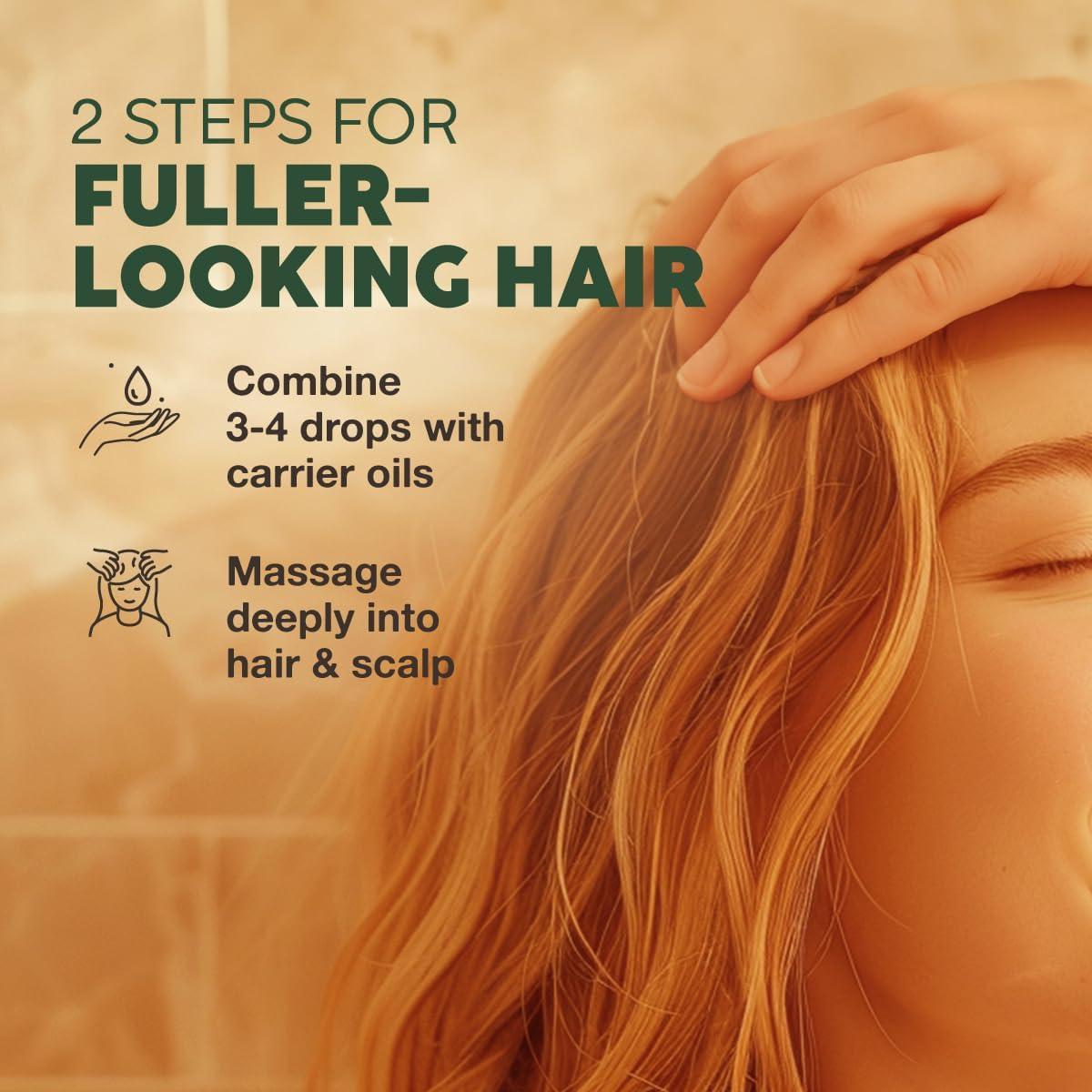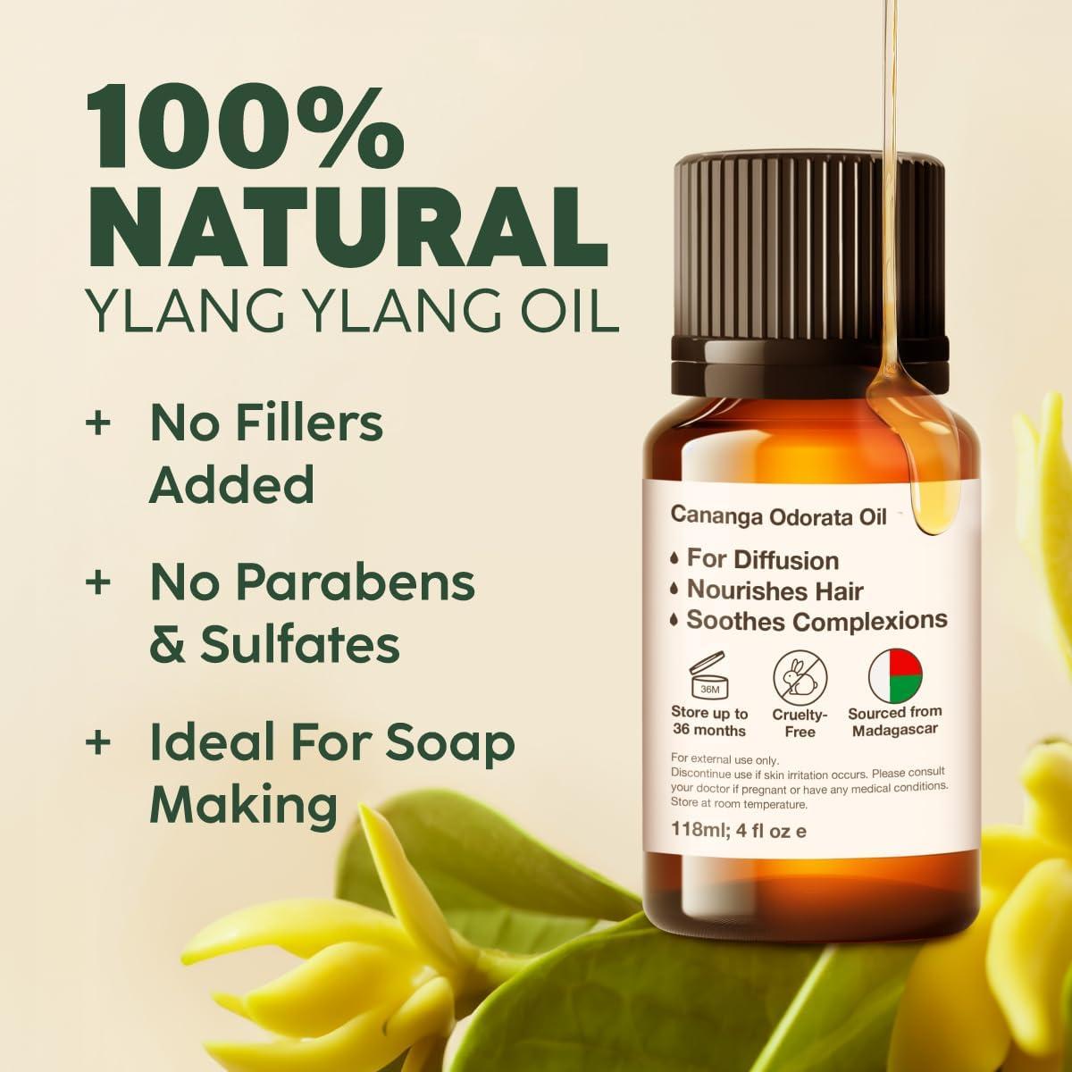 Promote healthier hair with ylang ylang oil. Ylang-ylang Essential oil for hair promotes fuller-looking hair by nourishing the scalp. Use 3-4 drops of ylang ylang oil with a carrier oil and massage into your hair and scalp. This ylang ylang essential oil organic leaves hair looking healthy.