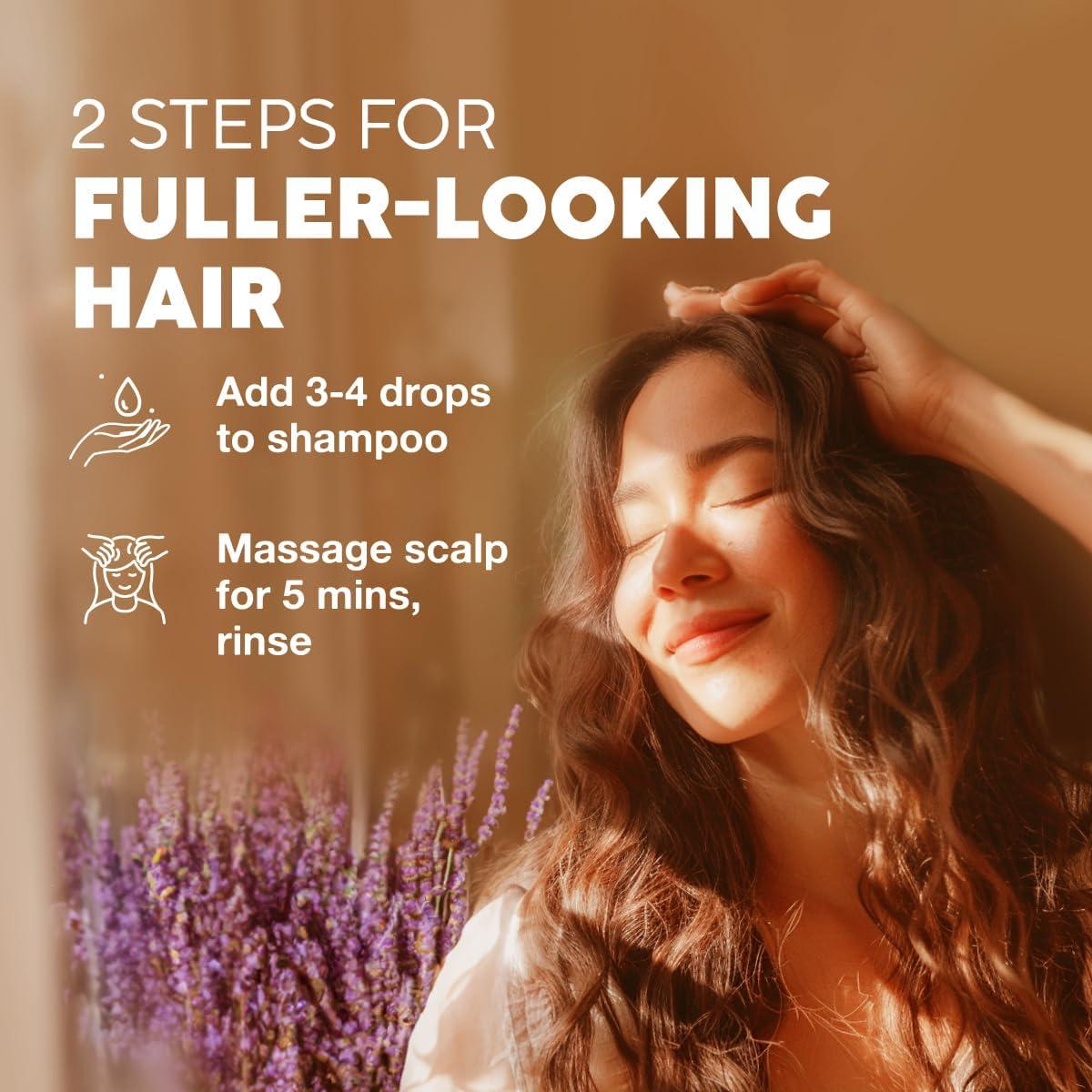 Your answer to fuller-looking hair. Essential oils lavender may have nourishing qualities to improve the appearance of fuller-looking hair. Apply lavender oil for hair on hair and scalp with carrier oil to enhance hair care routines.